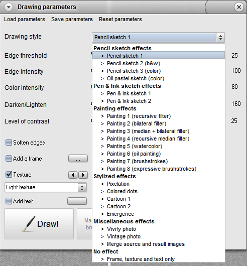The process is pretty simple: load a picture, choose the effect, tweak the options while watching the preview, and press the Draw Button. Just like that. In that order. Over and over.