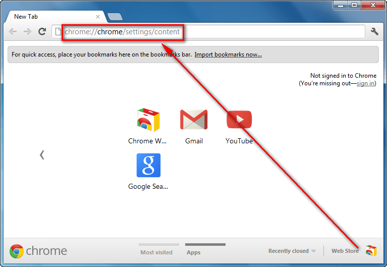 - Run Chrome, type “chrome://chrome/settings/content“ (without the quotes) in the URL/address bar, and hit Enter on your keyboard: