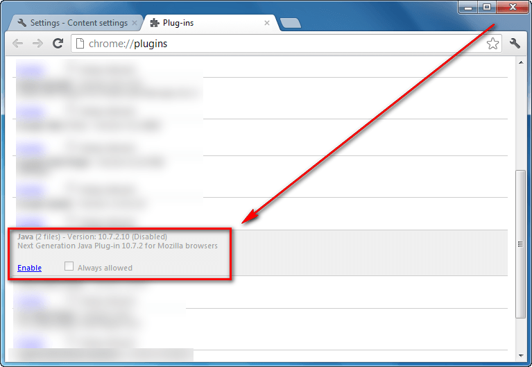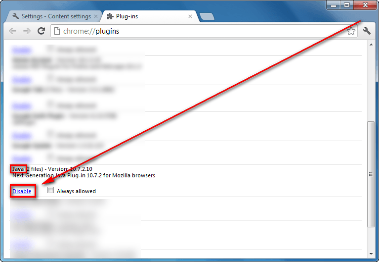 - When you click “Disable individual plug-ins…”, a list will open that shows all the plug-ins Chrome has installed. Scroll down the list to find “Java” and click “Disable” for it: