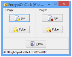 EncryptOnClick has five main buttons. You can encrypt or decrypt files or folders, and close the program. Choosing to encrypt requires you to enter a password for encryption, and when you’re done choosing, it’ll spit out EOC files. This are actually standard passworded, encrypted archive files, readable by programs like 7-zip. This means that, if at any time in the future, you need the files back but don’t want to reinstall EncryptOnClick, it’s a simple procedure to remove the data.